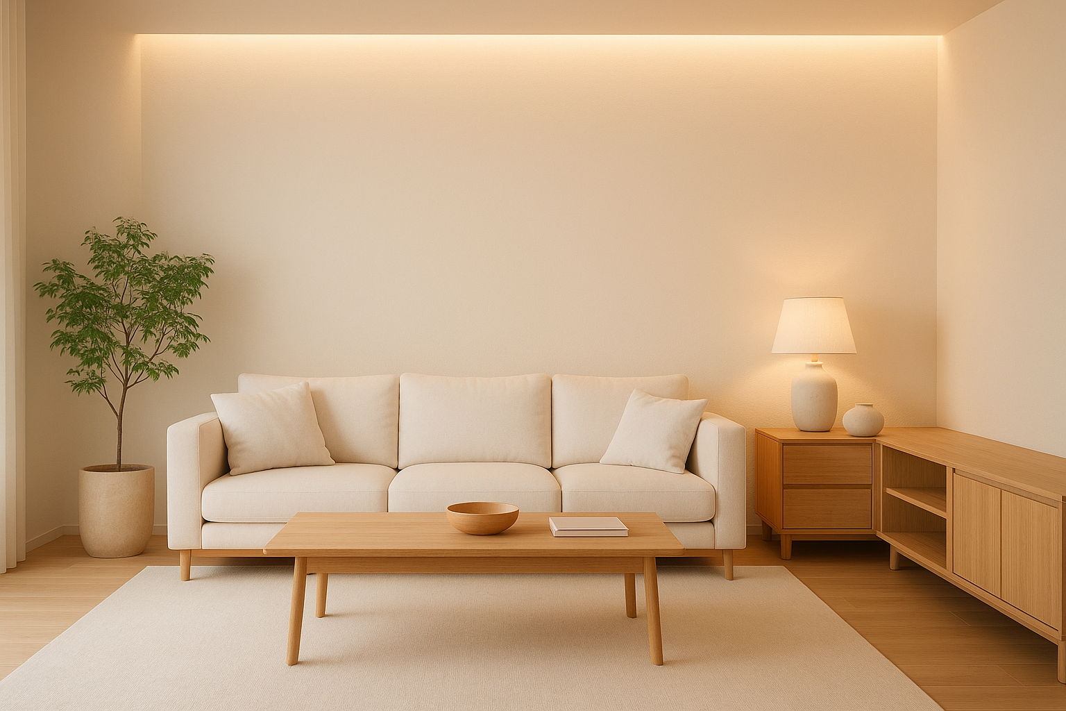 เลือกใช้ไฟ Warm White เพื่อเสริมบรรยากาศสงบ เรียบง่าย มักใช้หลอดไฟทรงกลม โคมไฟตั้งพื้นหรือไฟซ่อนตามขอบ