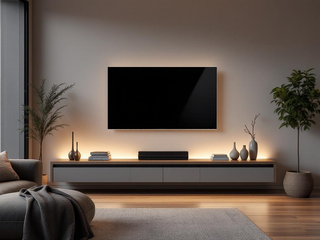 ใช้รางไฟ LED ซ่อนใต้ชั้นวางทีวีและชั้นโชว์ของ ทำให้มุมดูทีวีดูอบอุ่น ไม่แสบตา และช่วยเน้นเฟอร์นิเจอร์