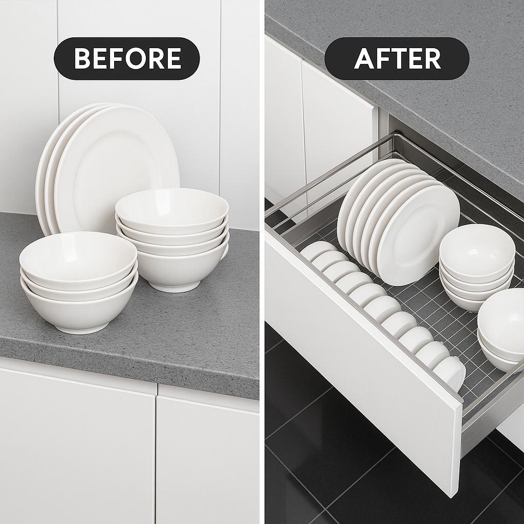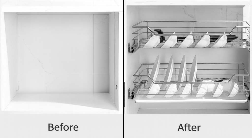 การติดตั้งตะกร้าคว่ำจานไว้ภายในตู้ครัวช่วยให้เคาน์เตอร์ครัวว่างมากขึ้น ใช้พื้นที่ในตู้ครัวได้เต็มที่ ทำให้ครัวดูโล่งและสะอาดตา