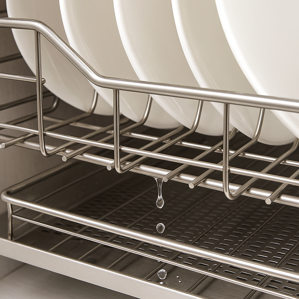 โครงลวดสแตนเลสถูกออกแบบให้โปร่ง สามารถระบายอากาศได้อย่างมีประสิทธิภาพ น้ำที่หยดจากจานหรือชามจะแห้งเร็วขึ้น