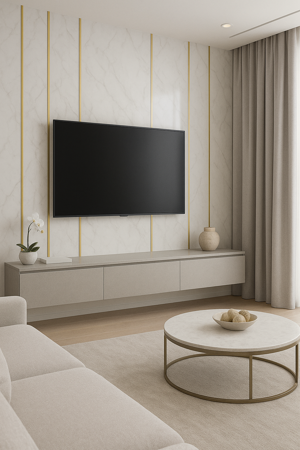 รายละเอียดฉาก: ผนังทีวีหินอ่อนสีขาวแทรกเส้นคิ้วอลูมิเนียมทองแนวตั้ง เพิ่มมิติหรูหรา