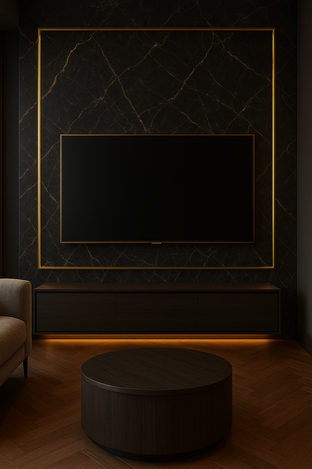 รายละเอียดฉาก: ทีวีติดผนังขนาดใหญ่ แซมด้วยเส้นทองเข้มล้อมกรอบ เพิ่มไฟซ่อน LED หลังผนัง