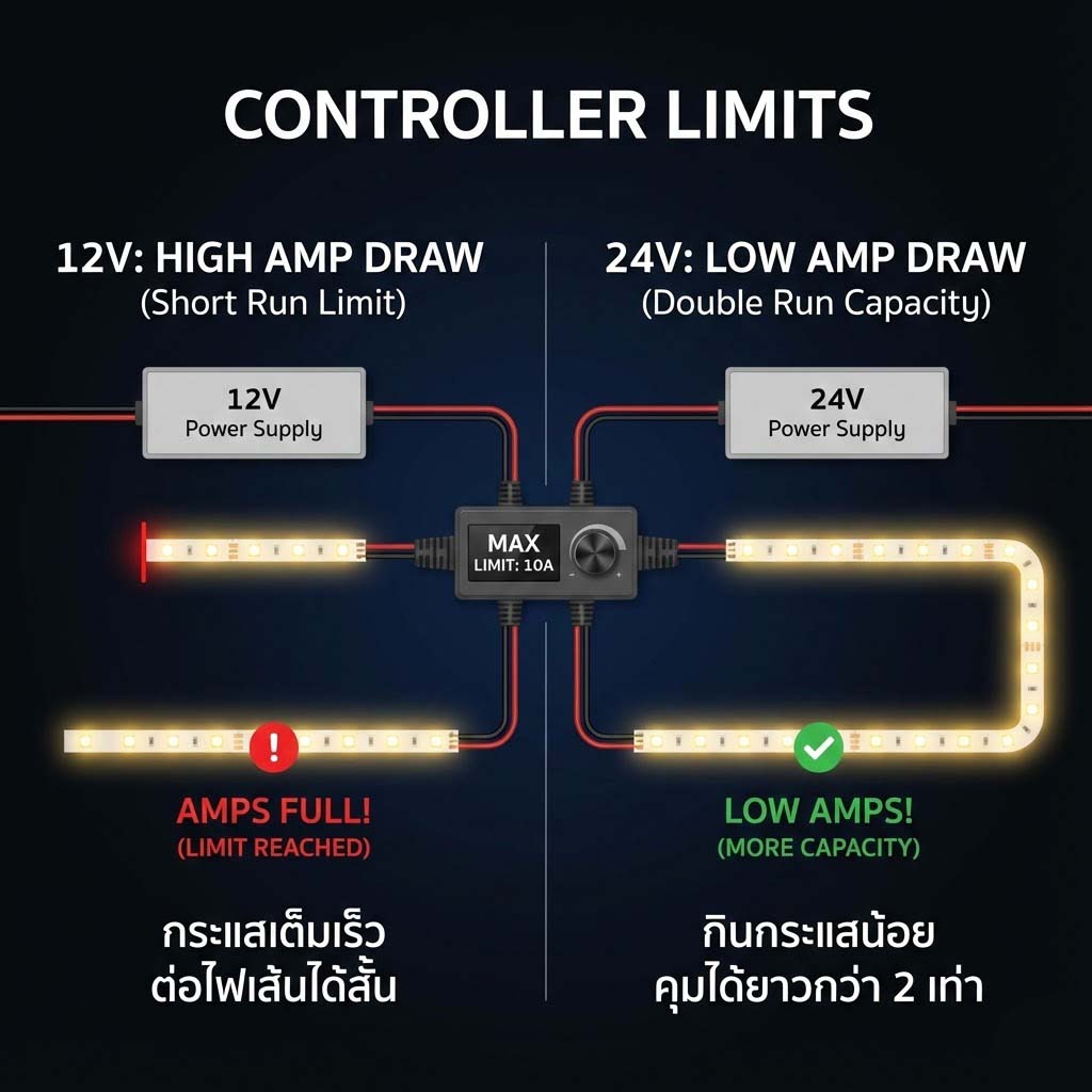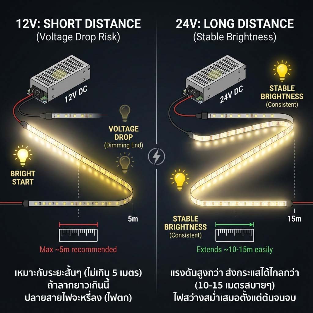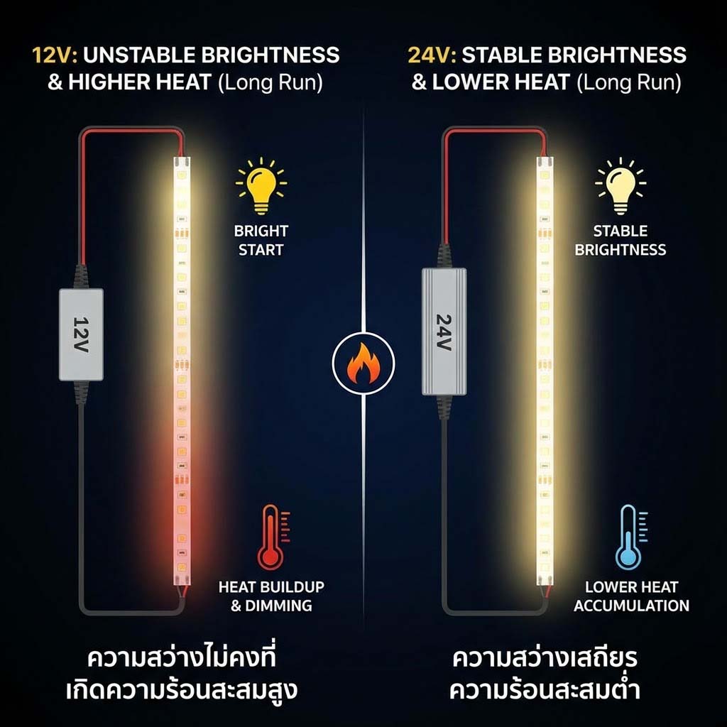 สาเหตุหลักมักเกิดจากการเลือกใช้ระบบไฟ 12V ในระยะที่ยาวเกินไป